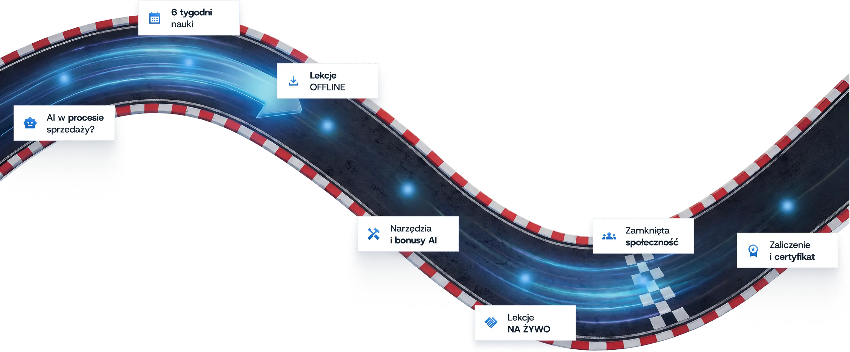 To intensywny, 6-tygodniowy program w formule kohortowej, który łączy cotygodniowe spotkania na żywo z Szymonem i zaproszonymi ekspertami oraz wsparcie społeczności. W trakcie programu pracujesz nad projektem zaliczeniowym, po którym otrzymasz certyfikat potwierdzający Twoje nowe kompetencje w sprzedaży ze wsparciem AI.